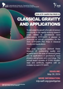 To stimulate the growth of a Latin-American community in the rapidly evolving research areas related to gravitational wave observations, ICTP-SAIFR is pleased to announce an annual competition for the  2026 ICTP-SAIFR PhD Prize in Classical Gravity and Applications.