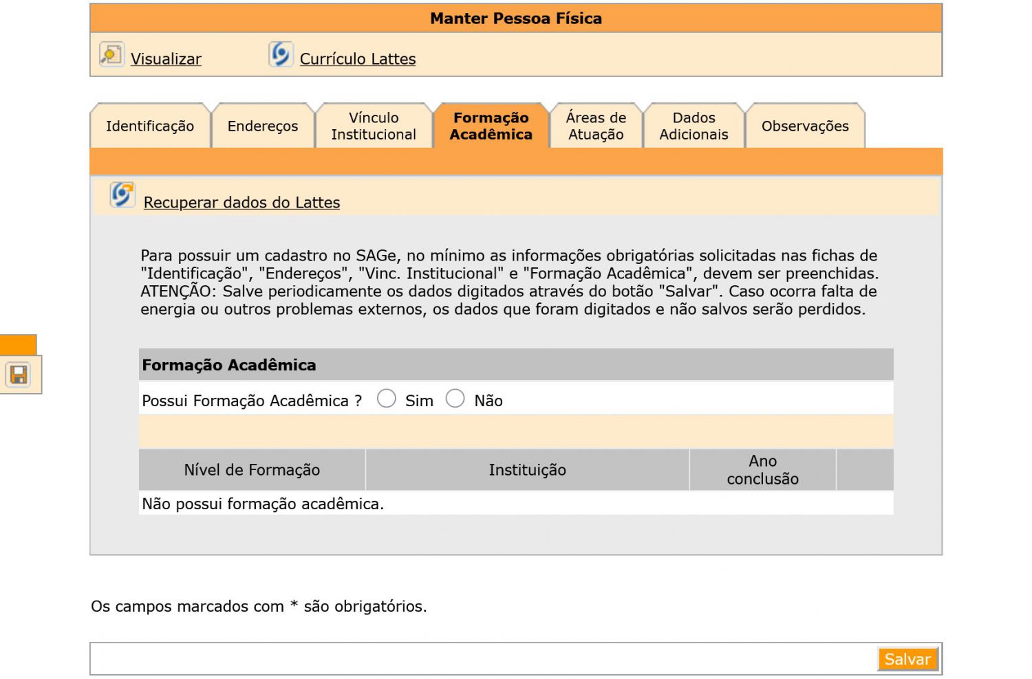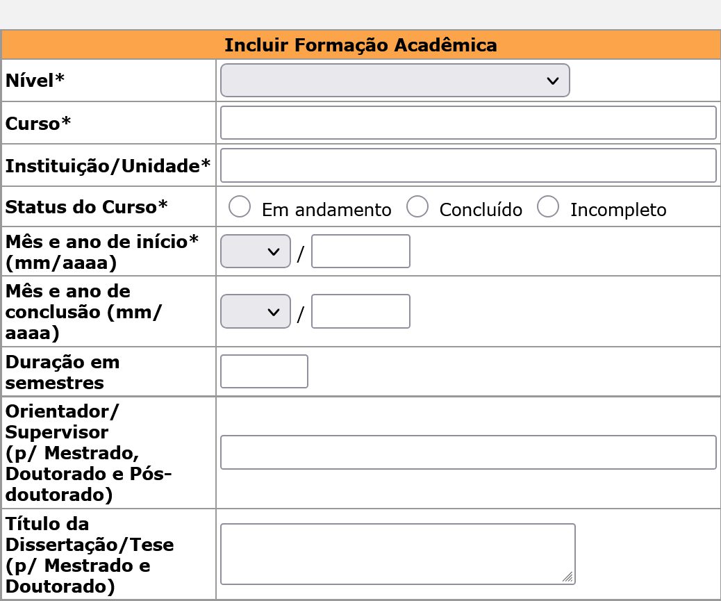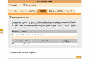 11) Click on “Formação Acadêmica” ►Select ”Sim” in the “Formação Acadêmica” field ► “Incluir”