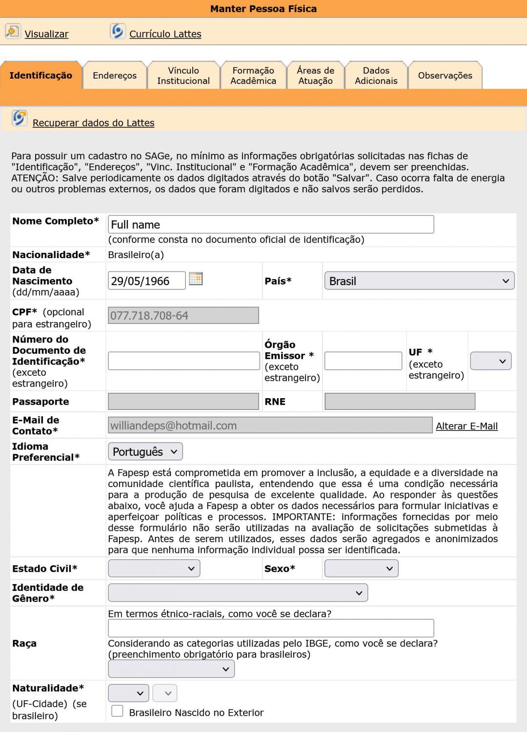 7) Click on “Identificação” ► Fill in all fields marked with an asterisk (*). If you are not Brazilian, you may leave the following fields blank: ‘CPF’, ‘Número de Identificação’, ‘Órgão Emissor’, ‘UF’, and ‘Naturalidade’ (at the bottom of the page). You may also choose English as your preferred language under ‘Idioma Preferencial’. ► On field “Estado Civil”, select your marital status (for instance: married = “casado” and single = “solteiro”) ► On field “Sexo”, choose between male (“masculino”) or female (“feminino”) ► Under “Identidade de Gênero”, choose the option that best describes your gender identity.