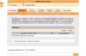 9) Click on “Endereços” ► “Incluir” ► on field “Logradouro”, provide the institute address: Rua Dr. Bento Teobaldo Ferraz 271, Bloco 2 – Barra Funda CEP:01140-070 São Paulo; and on the field “Tipo”, write “Comercial” ►Salvar
