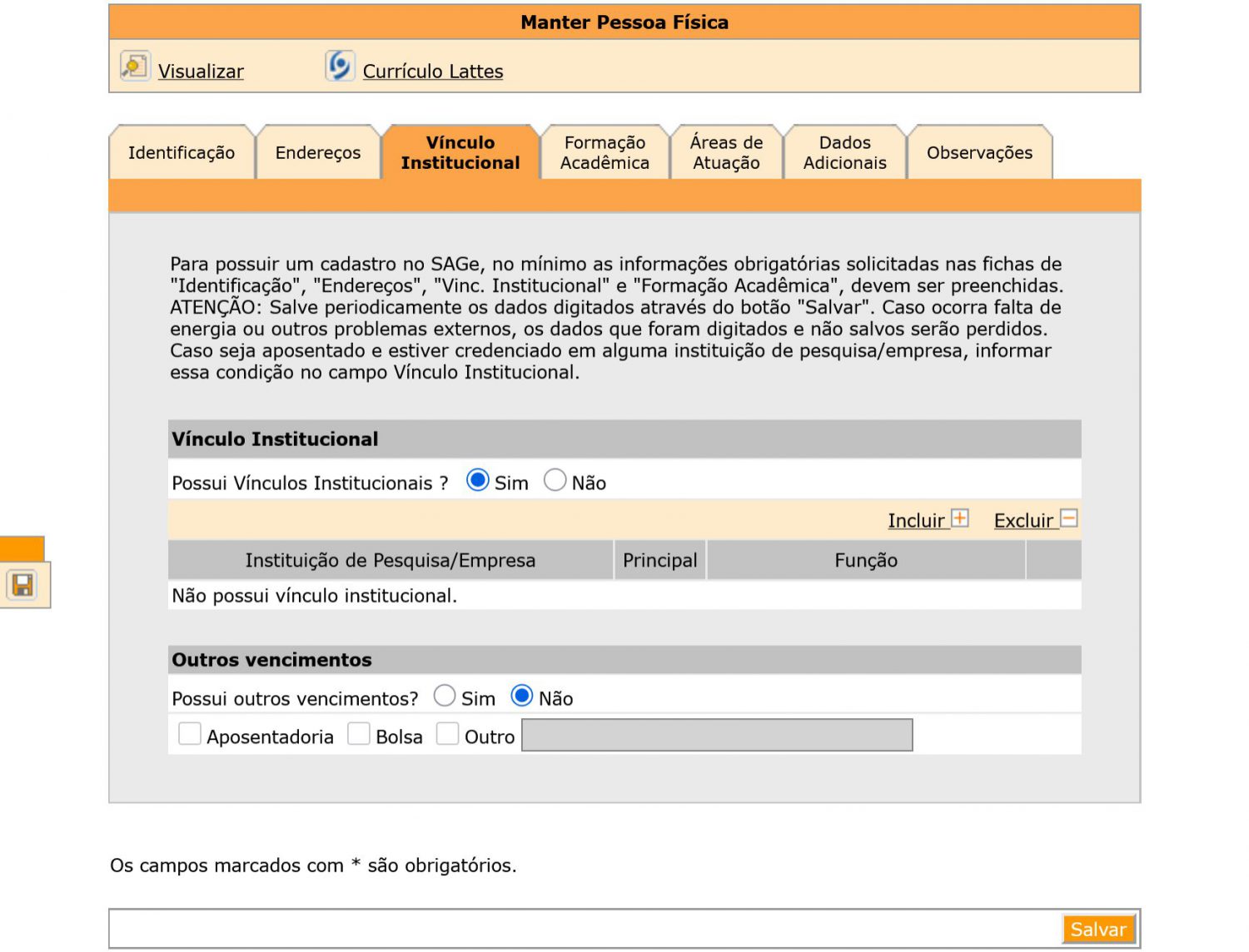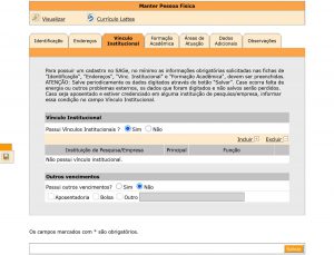 10) Click on “Vínculo Institucional” section ► On “Possui Vínculos Institucionais?” field, click on option “Não”. Later, after your arrival you will change this to “Sim” and choose “Instituto de Física Teórica” as your “Vínculo institucional” ►To finish, select the option “Não” under “Outros Vencimentos” ►Click on “Salvar” at the bottom