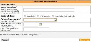 3) Fill out all the fields, except CPF if you do not have it yet: Full name; Nationality; Country of birth; Date of birth ► Click on “Confirmar”