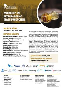 The Fraunhofer ISC in Germany (www.isc.fraunhofer.de), in collaboration with the CeRTEV team (www.certev.ufscar.br) and ICTP-SAIFR, is pleased to announce the First Workshop on Optimization of Glass Production, to be held at IFT-UNESP at April 24, 2026, with the aim to present and transfer knowledge of glass production and its optimization with a focus on energy consumption and sustainable production.